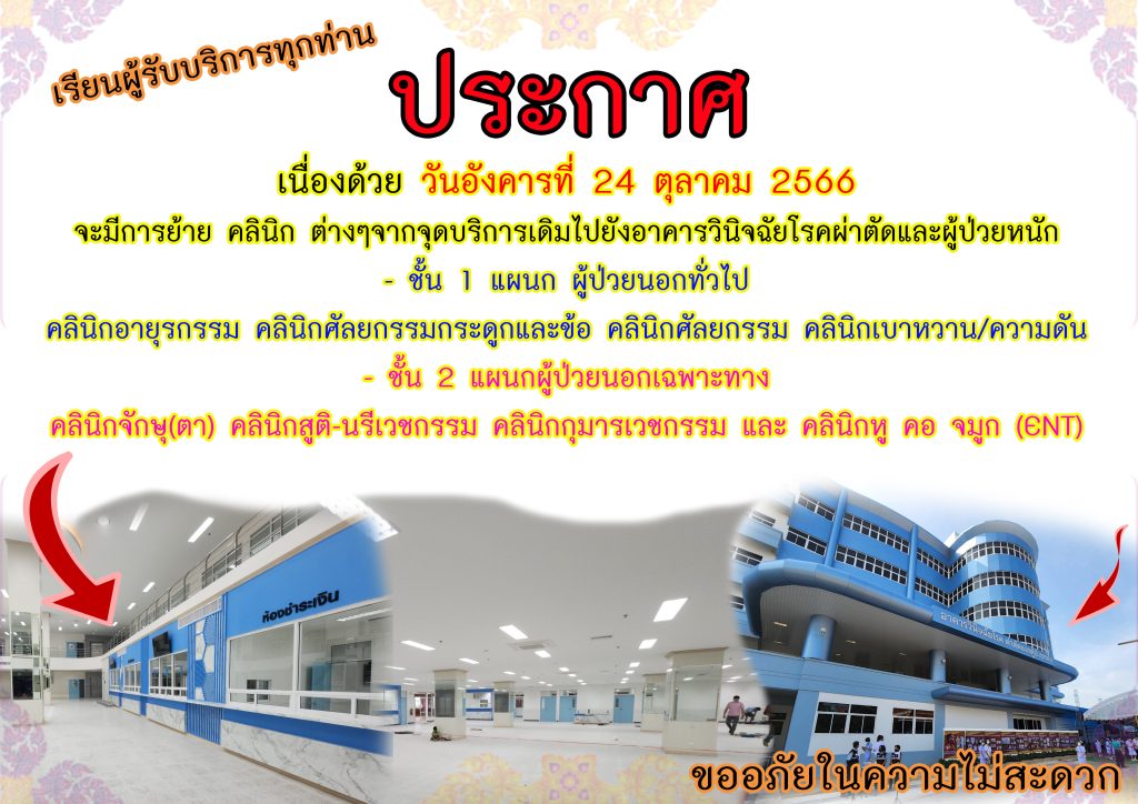 ประกาศการย้ายคลินิกต่างๆ ไปยังอาคารวินิจฉัยโรคผ่าตัดและผู้ป่วยหนัก