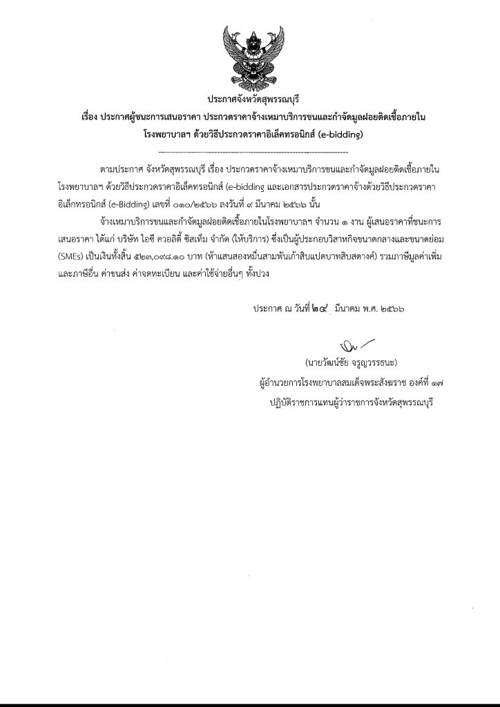 ประกาศผู้ชนะการเสนอราคาประกวดราคาจ้างเหมาบริการขนและกำจัดมูลฝอยติดเชื้อภายในโรงพยาบาลฯ