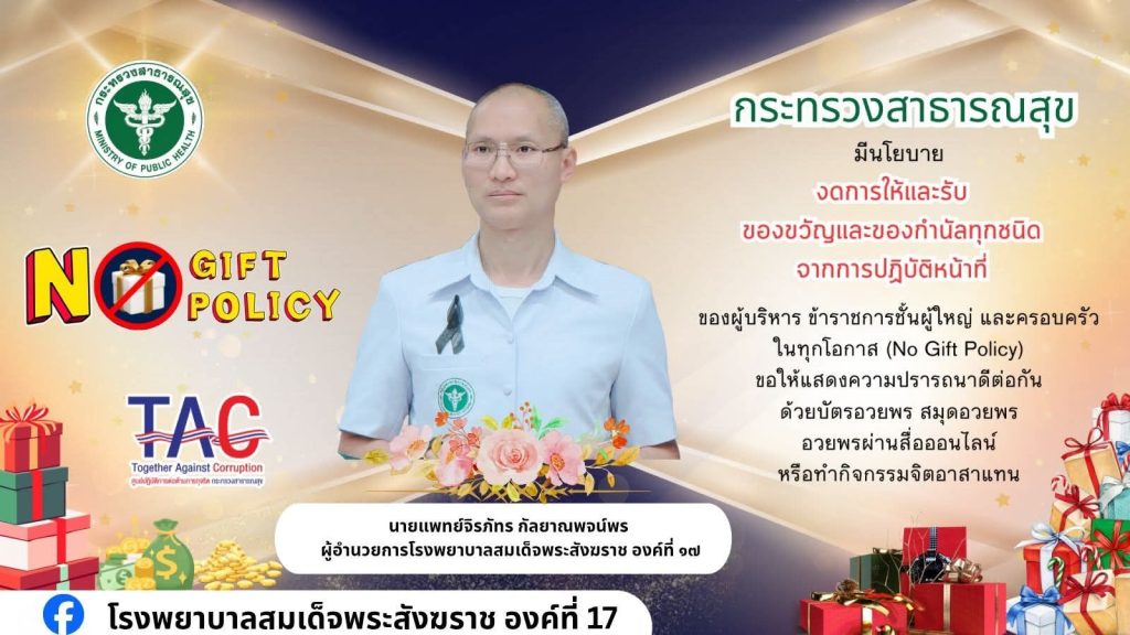 1. มีประกาศเจนารมณ์เป็นหน่วยงานที่เจ้าหน้าที่ของรัฐทุกคนไม่รับของขวัญและของกำนัลทุกชนิดจากการปฏิบัติหน้าที่ (No Gift Policy) ของปีงบประมาณ พ.ศ. 2569 ที่มีลักษณะเป็น Infographic No Gift Policy ในนามหัวหน้าหน่วยงานอยู่หน้าเว็บไซต์หลักของหน่วยงาน